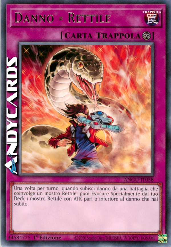 Una volta per turno, quando subisci danni da combattimento in una battaglia che coinvolge un mostro di Tipo Rettile, puoi Evocare tramite Evocazione Speciale 1 mostro di Tipo Rettile dal tuo Deck il cui ATK sia pari o inferiore ai danni da combattimento che hai subito.