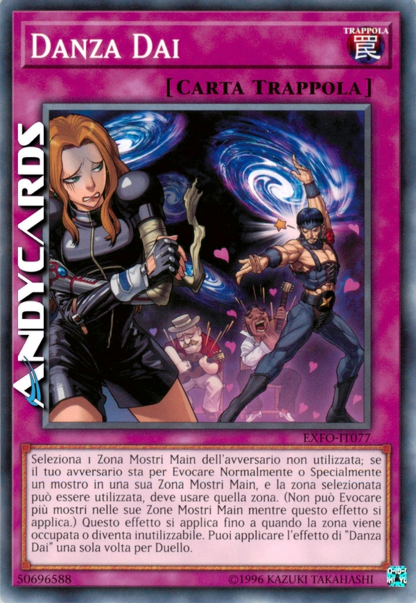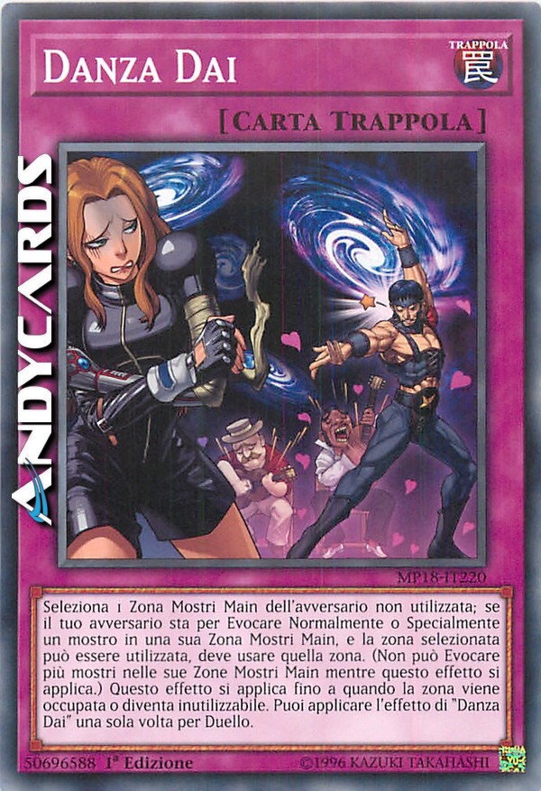 Seleziona 1 Zona Mostri Main dell'avversario non utilizzata; se il tuo avversario sta per Evocare Normalmente o Specialmente un mostro in una sua Zona Mostri Main, e la zona selezionata può essere utilizzata, deve usare quella zona. (Non può Evocare più mostri nelle sue Zone Mostri Main mentre questo effetto si applica.) Questo effetto si applica fino a quando la zona viene occupata o diventa inutilizzabile. Puoi applicare l'effetto di "Danza Dai" una sola volta per Duello.