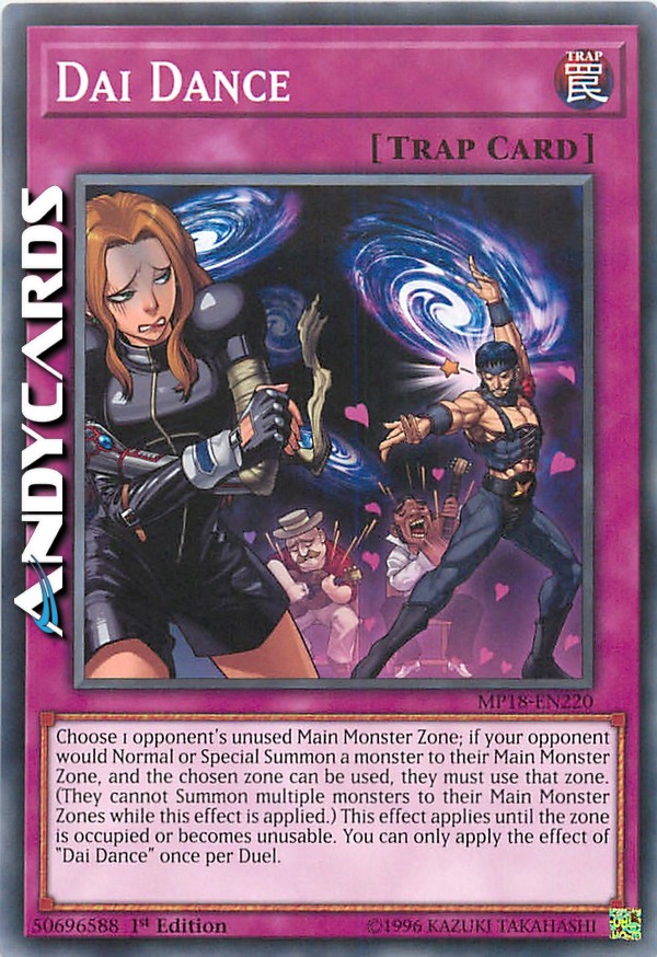 Choose 1 opponent's unused Main Monster Zones; if your opponent would Normal Summon/Set or Special Summon a monster to their Main Monster Zone, and the chosen zone can be used, they must use that zone. (They cannot Summon multiple monsters to their Main Monster Zones while this effect is applied.) This effect is applies until the zone is occupied or becomes unusable. You can only apply the effect of "Dai Dance" once per Duel.
