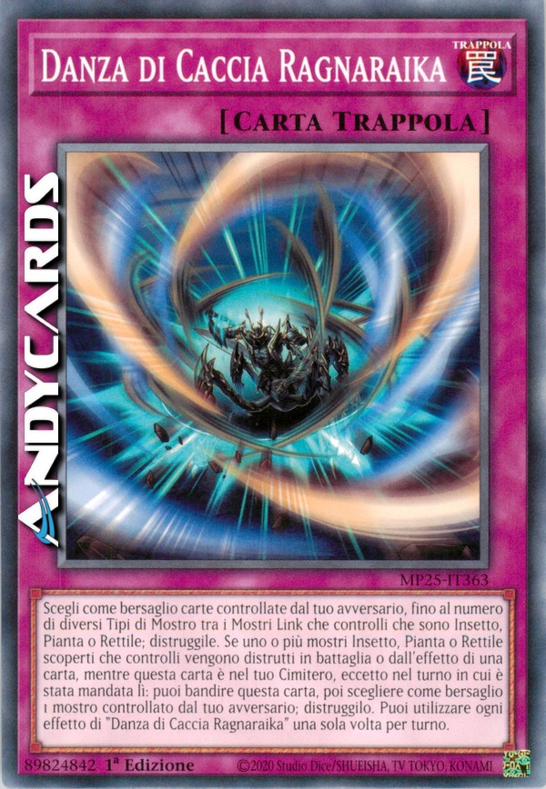 Scegli come bersaglio carte controllate dal tuo avversario, fino al numero di diversi Tipi di Mostro tra i Mostri Link che controlli che sono Insetto, Pianta o Rettile; distruggile. Se uno o più mostri Insetto, Pianta o Rettile scoperti che controlli vengono distrutti in battaglia o dall'effetto di una carta, mentre questa carta è nel tuo Cimitero, eccetto nel turno in cui è stata mandata lì: puoi bandire questa carta, poi scegliere come bersaglio 1 mostro controllato dal tuo avversario; distruggilo. Puoi utilizzare ogni effetto di "Danza di Caccia Ragnaraika" una sola volta per turno.
