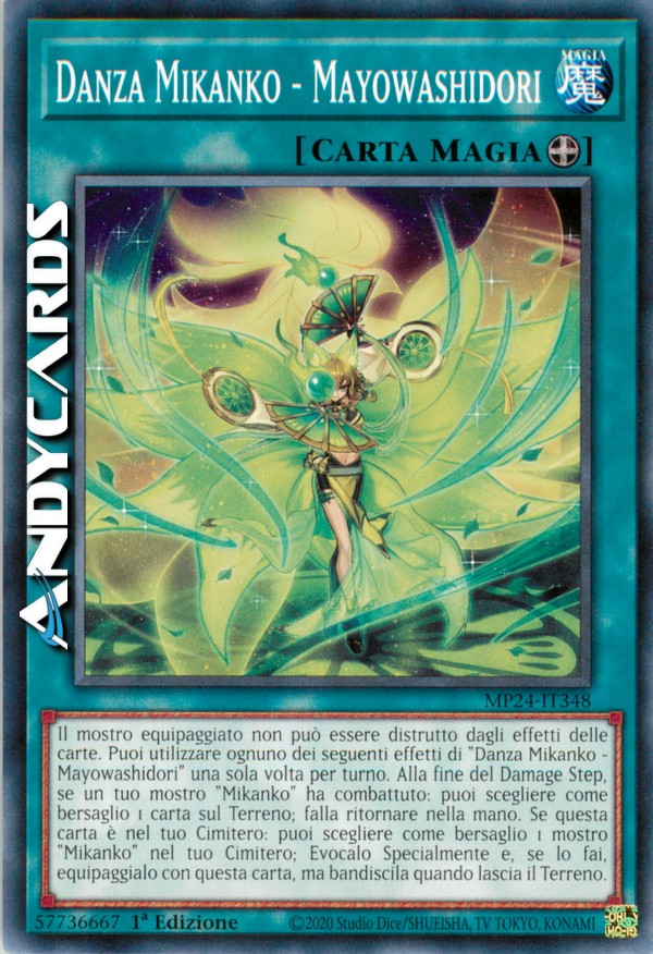 Il mostro equipaggiato non può essere distrutto dagli effetti delle carte. Puoi utilizzare ognuno dei seguenti effetti di "Danza Mikanko - Mayowashidori" una sola volta per turno. Alla fine del Damage Step, se un tuo mostro "Mikanko" ha combattuto: puoi scegliere come bersaglio 1 carta sul Terreno; falla ritornare nella mano. Se questa carta è nel tuo Cimitero: puoi scegliere come bersaglio 1 mostro "Mikanko" nel tuo Cimitero; Evocalo Specialmente e, se lo fai, equipaggialo con questa carta, ma bandiscila quando lascia il Terreno.