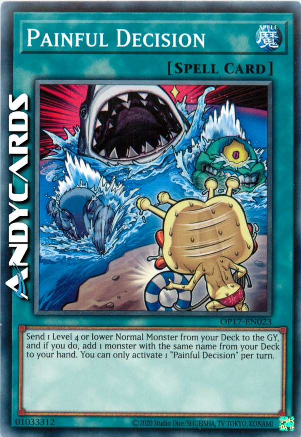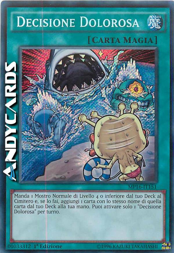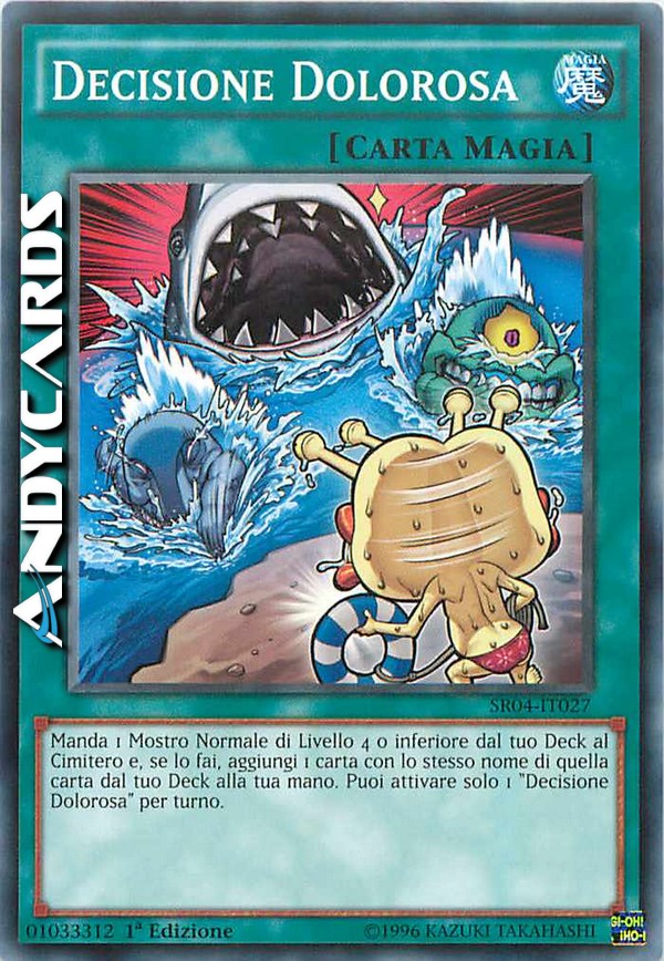 Manda 1 Mostro Normale di Livello 4 o inferiore dal tuo Deck al Cimitero e, se lo fai, aggiungi 1 carta con lo stesso nome di quella carta dal tuo Deck alla tua mano. Puoi attivare solo 1 "Decisione Dolorosa" per turno.