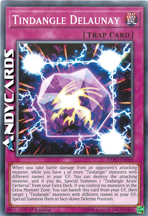 When you take battle damage from an opponent's attacking monster while you have 3 or more "Tindangle" monsters with different names in your GY: You can destroy the attacking monster, and if you do, Special Summon 1 "Tindangle Acute Cerberus" from your Extra Deck. If you control no monsters in the Extra Monster Zone: You can banish this card from your GY, then target 3 "Tindangle" monsters with different names in your GY; Special Summon them in face-down Defense Position.