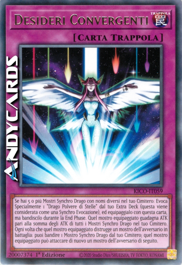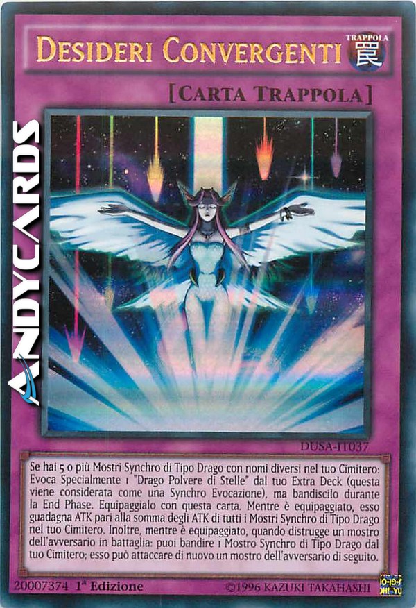 Se hai 5 o più Mostri Synchro di Tipo Drago con nomi diversi nel tuo Cimitero: Evoca Specialmente 1 "Drago Polvere di Stelle" dal tuo Extra Deck (questa viene considerata come una Synchro Evocazione), ma bandiscilo durante la End Phase. Equipaggialo con questa carta. Mentre è equipaggiato, esso guadagna ATK pari alla somma degli ATK di tutti i Mostri Synchro di Tipo Drago nel tuo Cimitero. Inoltre, mentre è equipaggiato, quando distrugge un mostro dell'avversario in battaglia: puoi bandire 1 Mostro Synchro di Tipo Drago dal tuo Cimitero; esso può attaccare di nuovo un mostro dell'avversario di seguito.