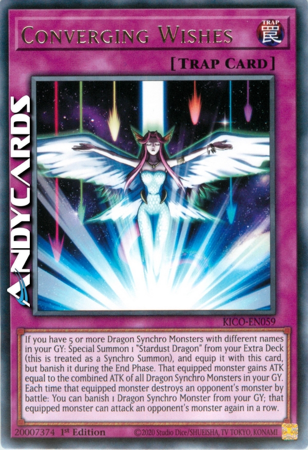 If you have 5 or more Dragon Synchro Monsters with different names in your GY: Special Summon 1 "Stardust Dragon" from your Extra Deck (this is treated as a Synchro Summon), and equip it with this card, but banish it during the End Phase. That equipped monster gains ATK equal to the combined ATK of all Dragon Synchro Monsters in your GY. Each time that equipped monster destroys an opponent's monster by battle: You can banish 1 Dragon Synchro Monster from your GY; that equipped monster can attack an opponent's monster again in a row.