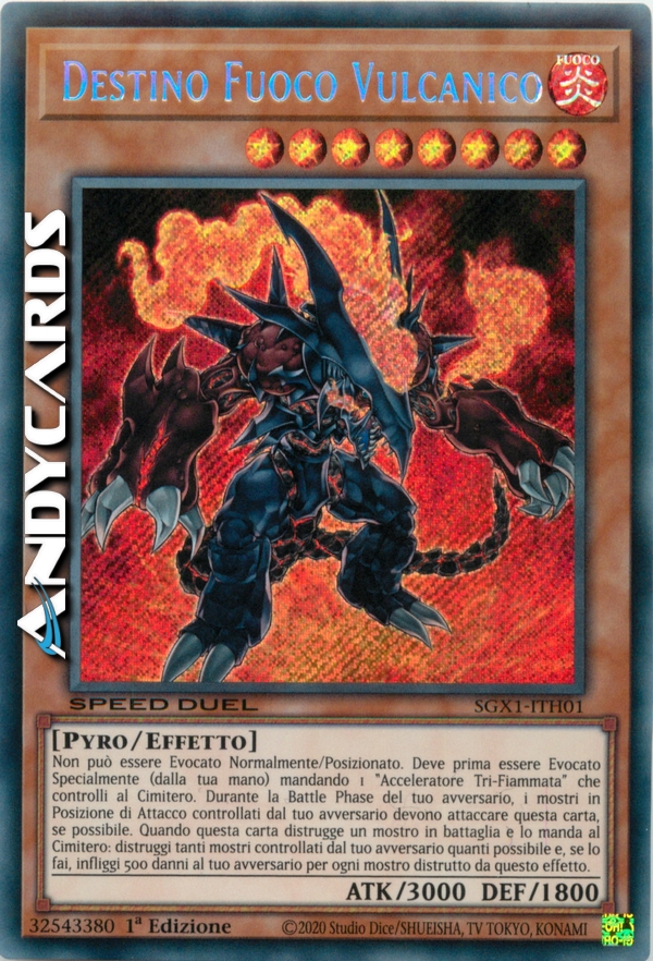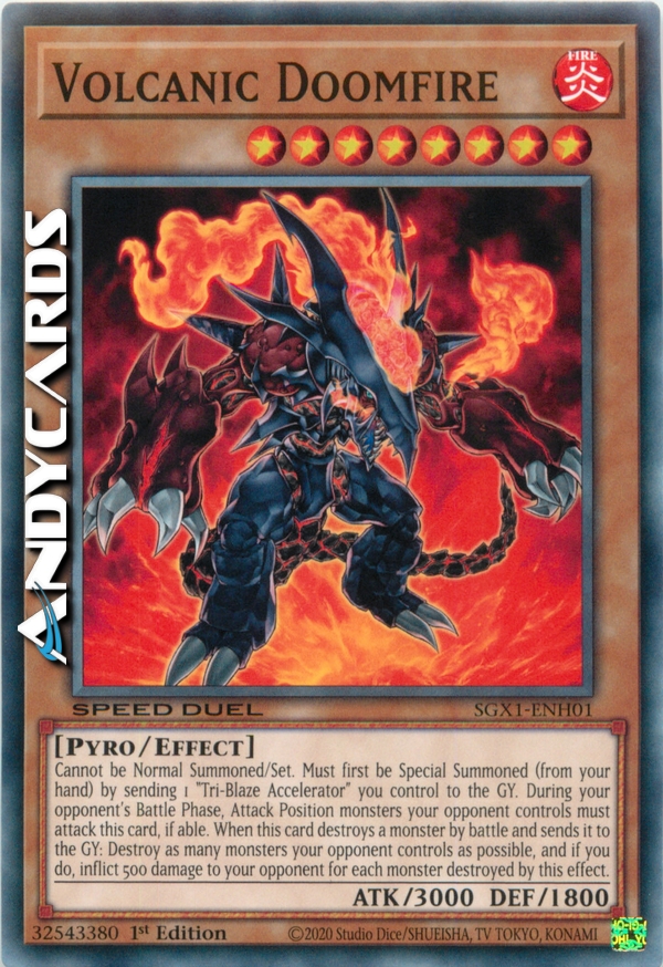 Questa carta non può essere Evocata tramite Evocazione Normale o Posizionata. Questa carta può essere Evocata tramite Evocazione Speciale mandando un "Acceleratore Tri-Fiammata" scoperto che controlli al Cimitero. Durante la Battle Phase del tuo avversario, il tuo avversario deve attaccare questo mostro con un mostro in Posizione di Attacco che controlla. Quando questa carta distrugge un mostro e lo manda al Cimitero, distruggi tutti i mostri che il tuo avversario controlla ed infliggi 500 danni al tuo avversario per ogni mostro distrutto per questo effetto. NUOVO TESTO: Questa carta non può essere Evocata tramite Evocazione Normale o Posizionata. Questa carta può essere Evocata solamente tramite Evocazione Speciale mandando un "Acceleratore Tri-Fiammata" scoperto che controlli al Cimitero. Durante la Battle Phase del tuo avversario, il tuo avversario deve attaccare questo mostro con un mostro in Posizione di Attacco che controlla. Quando questa carta distrugge un mostro e lo manda al Cimitero, distruggi tutti i mostri che il tuo avversario controlla ed infliggi 500 danni al tuo avversario per ogni mostro distrutto per questo effetto.