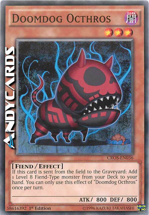If this card is sent from the field to the Graveyard: Add 1 Level 8 Fiend-Type monster from your Deck to your hand. You can only use this effect of "Doomdog Octhros" once per turn.