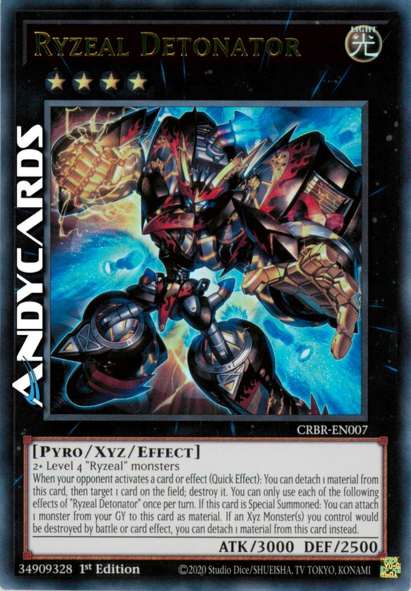 When your opponent activates a card or effect (Quick Effect): You can detach 1 material from this card, then target 1 card on the field; destroy it. You can only use each of the following effects of "Ryzeal Detonator" once per turn. If this card is Special Summoned: You can attach 1 monster from your GY to this card as material. If an Xyz Monster(s) you control would be destroyed by battle or card effect, you can detach 1 material from this card instead.