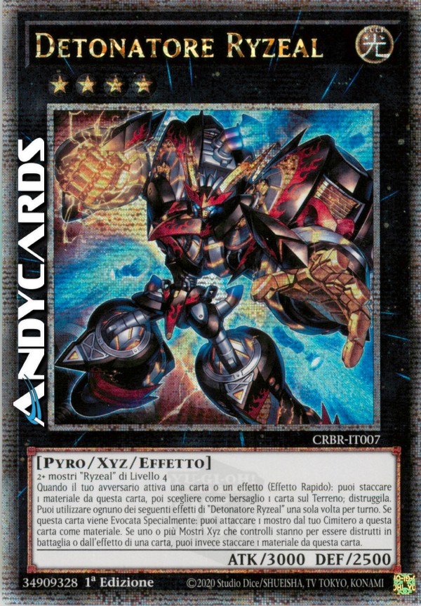 Quando il tuo avversario attiva una carta o un effetto (Effetto Rapido): puoi staccare 1 materiale da questa carta, poi scegliere come bersaglio 1 carta sul Terreno; distruggila. Puoi utilizzare ognuno dei seguenti effetti di "Detonatore Ryzeal" una sola volta per turno. Se questa carta viene Evocata Specialmente: puoi attaccare 1 mostro dal tuo Cimitero a questa carta come materiale. Se uno o più Mostri Xyz che controlli stanno per essere distrutti in battaglia o dall'effetto di una carta, puoi invece staccare 1 materiale da questa carta.