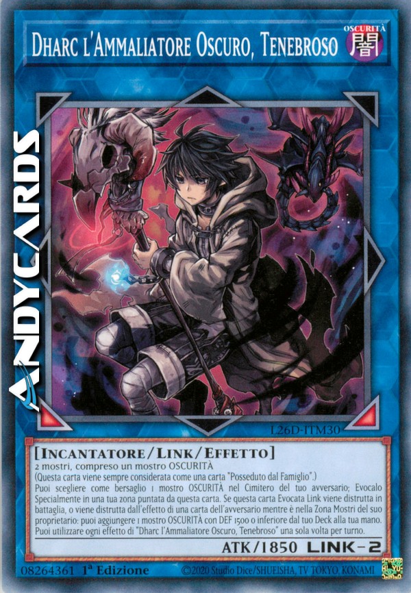 Puoi scegliere come bersaglio 1 mostro OSCURITÀ nel Cimitero del tuo avversario; Evocalo Specialmente in una tua zona puntata da questa carta. Se questa carta Evocata Link viene distrutta in battaglia, o viene distrutta dall'effetto di una carta dell'avversario mentre è nella Zona Mostri del suo proprietario: puoi aggiungere 1 mostro OSCURITÀ con DEF 1500 o inferiore dal tuo Deck alla tua mano. Puoi utilizzare ogni effetto di "Dharc l'Ammaliatore Oscuro, Tenebroso" una sola volta per turno.
