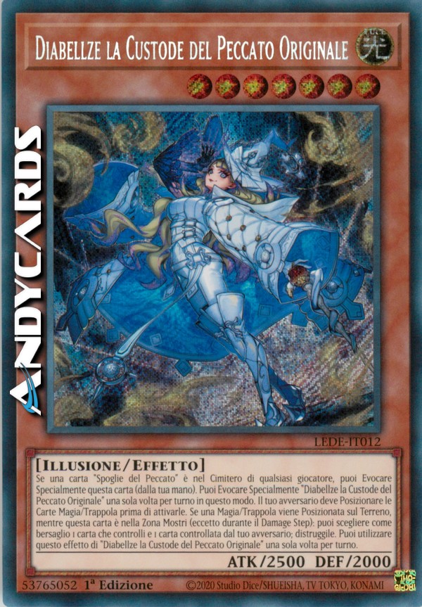 Se una carta "Spoglie del Peccato" è nel Cimitero di qualsiasi giocatore, puoi Evocare Specialmente questa carta (dalla tua mano). Puoi Evocare Specialmente "Diabellze la Custode del Peccato Originale" una sola volta per turno in questo modo. Il tuo avversario deve Posizionare le Carte Magia/Trappola prima di attivarle. Se una Magia/Trappola viene Posizionata sul Terreno, mentre questa carta è nella Zona Mostri (eccetto durante il Damage Step): puoi scegliere come bersaglio 1 carta che controlli e 1 carta controllata dal tuo avversario; distruggile. Puoi utilizzare questo effetto di "Diabellze la Custode del Peccato Originale" una sola volta per turno.