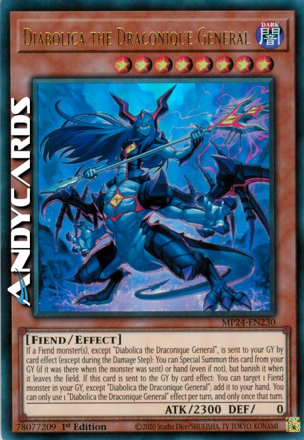 Se uno o più mostri Demone, eccetto "Diabolica il Generale Draconique", vengono mandati al tuo Cimitero dall'effetto di una carta (eccetto durante il Damage Step): puoi Evocare Specialmente questa carta dal tuo Cimitero (se era lì quando il mostro è stato mandato) o mano (anche se non era lì), ma bandiscila quando lascia il Terreno. Se questa carta viene mandata al Cimitero dall'effetto di una carta: puoi scegliere come bersaglio 1 mostro Demone nel tuo Cimitero, eccetto "Diabolica il Generale Draconique"; aggiungilo alla tua mano. Puoi utilizzare solo 1 effetto di "Diabolica il Generale Draconique" per turno, e solo una volta in quel turno.