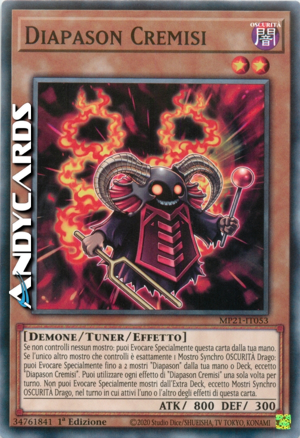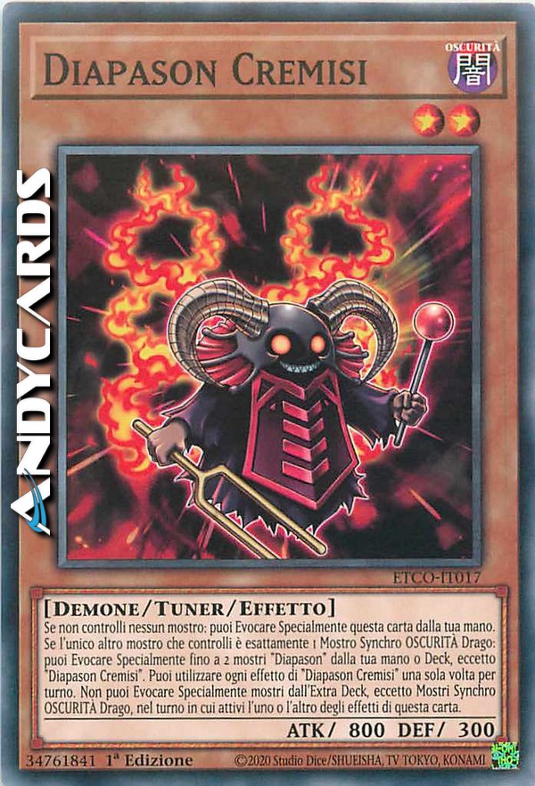 Se non controlli nessun mostro: puoi Evocare Specialmente questa carta dalla tua mano. Se l'unico altro mostro che controlli è esattamente 1 Mostro Synchro OSCURITÀ Drago: puoi Evocare Specialmente fino a 2 mostri "Diapason" dalla tua mano o Deck, eccetto "Diapason Cremisi". Puoi utilizzare ogni effetto di "Diapason Cremisi" una sola volta per turno. Non puoi Evocare Specialmente mostri dall'Extra Deck, eccetto Mostri Synchro OSCURITÀ Drago, nel turno in cui attivi l'uno o l'altro degli effetti di questa carta.