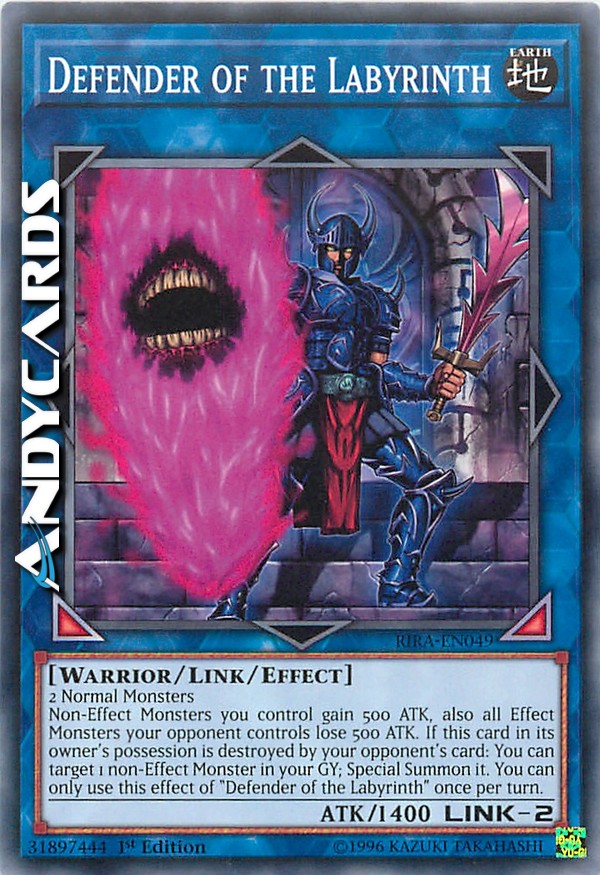 I Mostri non-con Effetto che controlli guadagnano 500 ATK, inoltre tutti i Mostri con Effetto controllati dal tuo avversario perdono 500 ATK. Se questa carta sotto il comando del suo proprietario viene distrutta da una carta del tuo avversario: puoi scegliere come bersaglio 1 Mostro non-con Effetto nel tuo Cimitero; Evocalo Specialmente. Puoi utilizzare questo effetto di "Difensore del Labirinto" una sola volta per turno.