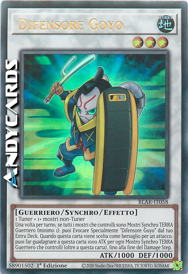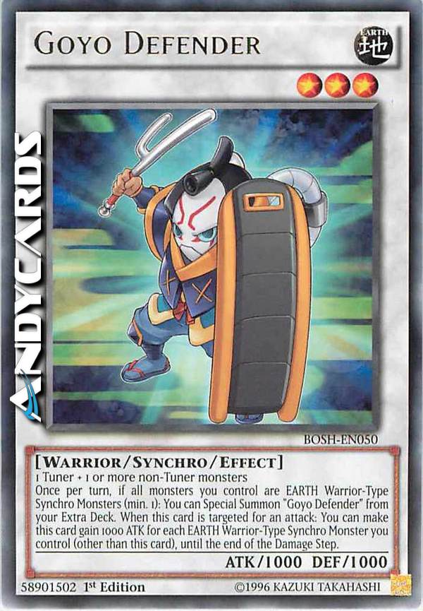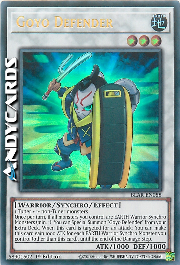 Una volta per turno, se tutti i mostri che controlli sono Mostri Synchro TERRA di Tipo Guerriero (minimo 1): puoi Evocare Specialmente "Difensore Goyo" dal tuo Extra Deck. Quando questa carta viene scelta come bersaglio per un attacco: puoi far guadagnare a questa carta 1000 ATK per ogni Mostro Synchro TERRA di Tipo Guerriero che controlli (oltre a questa carta), fino alla fine del Damage Step.