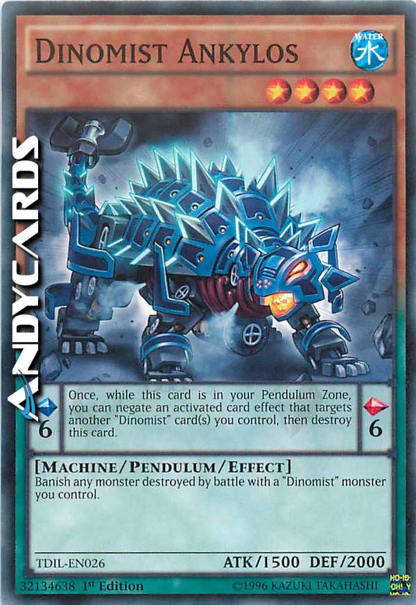Banish any monster destroyed by battle with a "Dinomist" monster you control. Pendulum Effect: Once, while this card is in your Pendulum Zone, you can negate an activated card effect that targets another "Dinomist" card(s) you control, then destroy this card.
