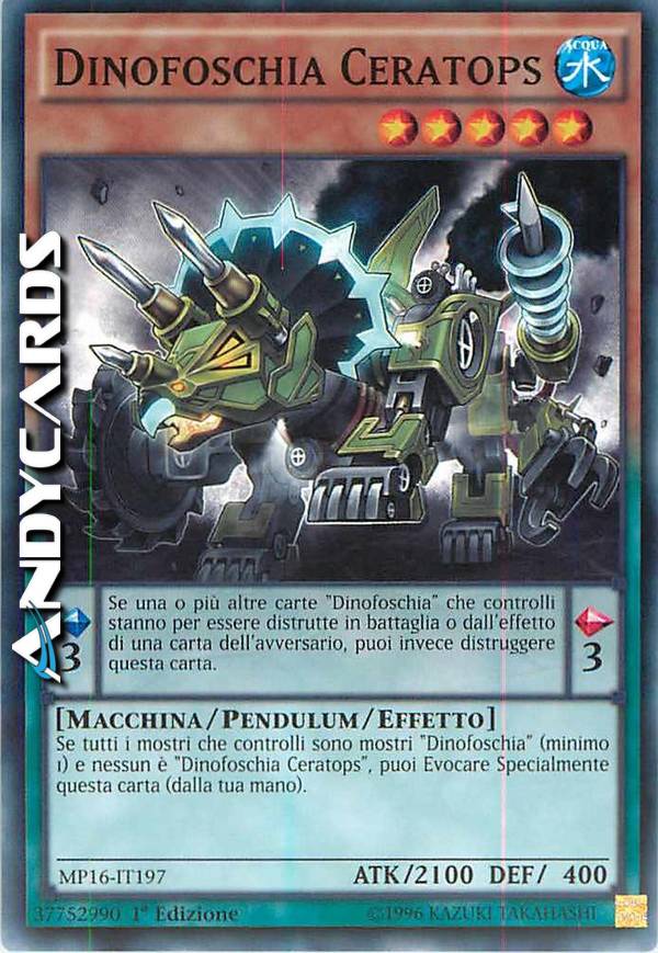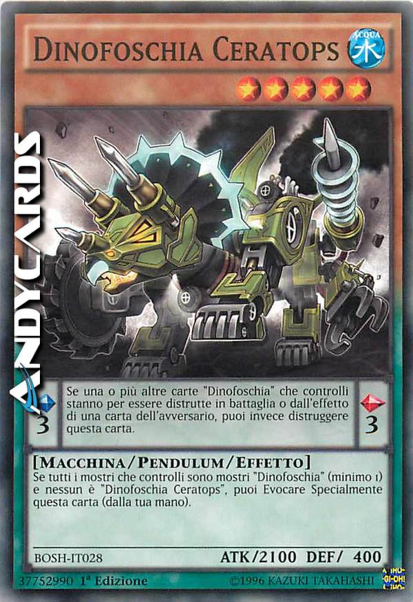 Se una o più altre carte "Dinofoschia" che controlli stanno per essere distrutte in battaglia o dall'effetto di una carta dell'avversario, puoi invece distruggere questa carta. Se tutti i mostri che controlli sono mostri "Dinofoschia" (minimo 1) e nessun è "Dinofoschia Ceratops", puoi Evocare Specialmente questa carta (dalla tua mano).