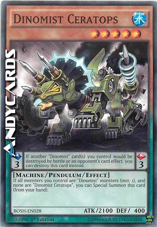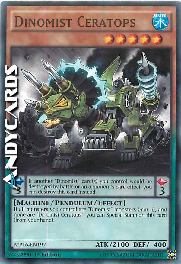 If all monsters you control are "Dinomist" monsters (min. 1), and none are "Dinomist Ceratops", you can Special Summon this card (from your hand). Pendulum Effect: If another "Dinomist" card(s) you control would be destroyed by battle or an opponent's card effect, you can destroy this card instead.