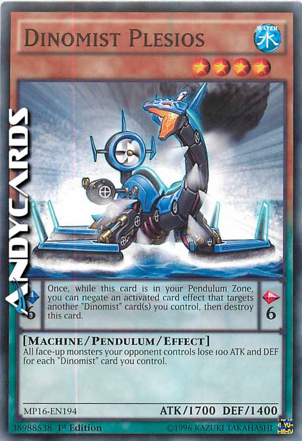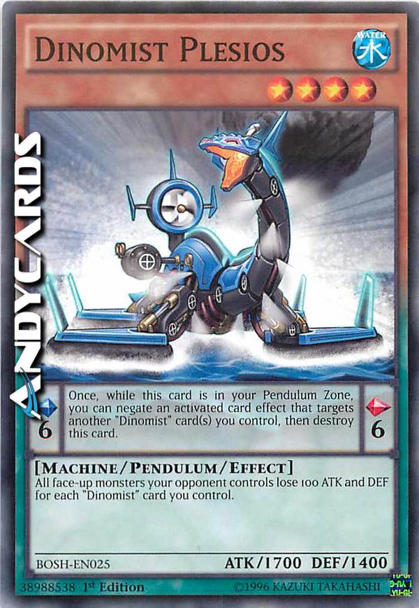 All face-up monsters your opponent controls lose 100 ATK and DEF for each "Dinomist" card you control. Pendulum Effect: Once, while this card is in your Pendulum Zone, you can negatean activated card effect that targets another "Dinomist" card(s) you control, thendestroy this card.