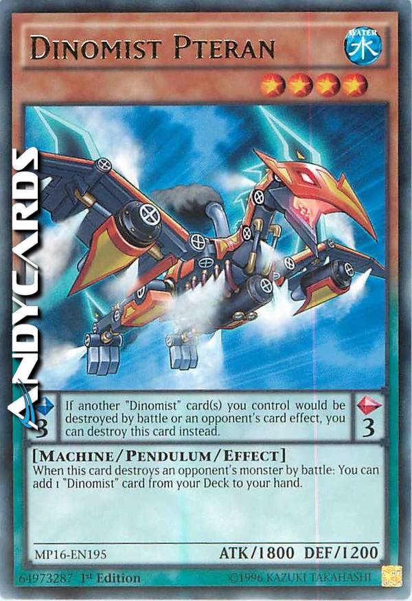 When this card destroys an opponent's monster by battle: You can add 1 "Dinomist" card from your Deck to your hand. - Pendulum Effect: If another "Dinomist" card(s) you control would be destroyed by battle or an opponent's card effect, you can destroy this card instead.