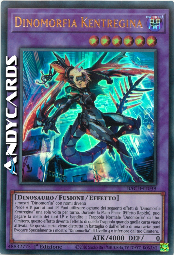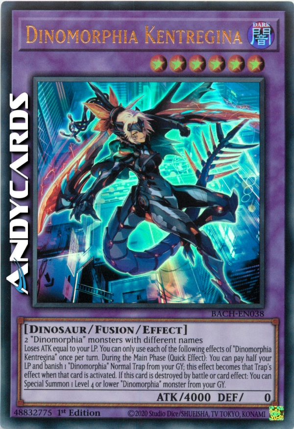 Perde ATK pari ai tuoi LP. Puoi utilizzare ognuno dei seguenti effetti di "Dinomorfia Kentregina" una sola volta per turno. Durante la Main Phase (Effetto Rapido): puoi pagare la metà dei tuoi LP e bandire 1 Trappola Normale "Dinomorfia" dal tuo Cimitero; questo effetto diventa l'effetto di quella Trappola quando quella carta viene attivata. Se questa carta viene distrutta in battaglia o dall'effetto di una carta: puoi Evocare Specialmente 1 mostro "Dinomorfia" di Livello 4 o inferiore dal tuo Cimitero.