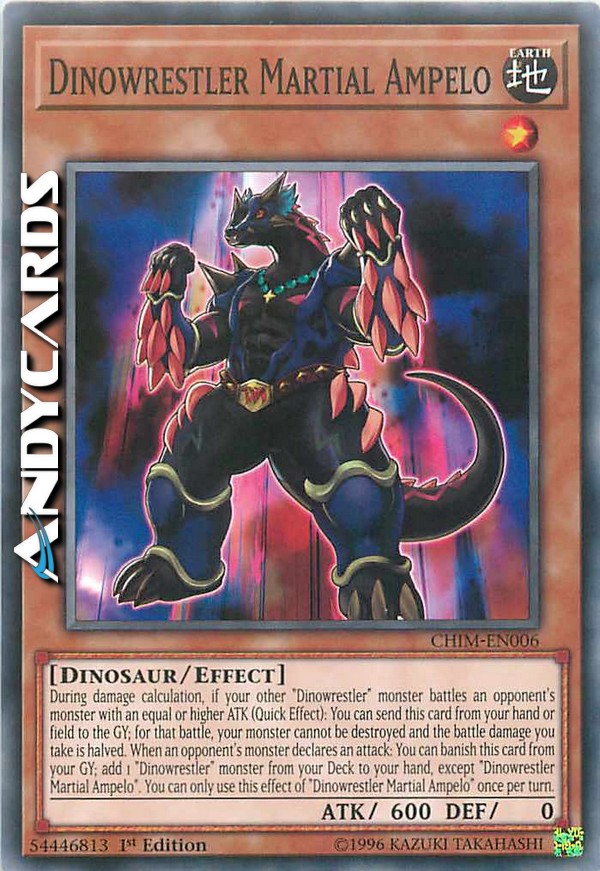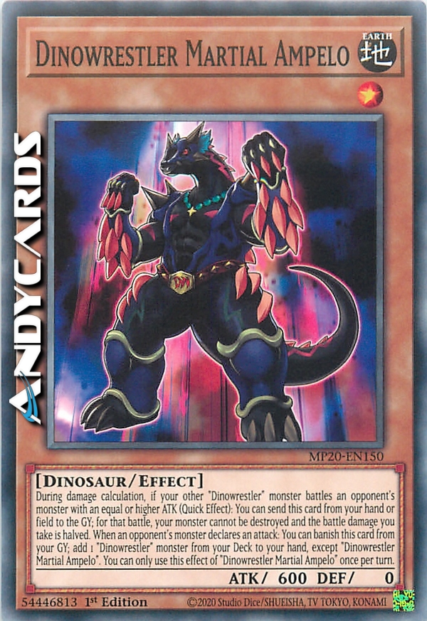 Durante il calcolo dei danni, se un tuo altro mostro "Dinowrestler" combatte con un mostro dell'avversario con ATK pari o superiore (Effetto Rapido): puoi mandare questa carta dalla tua mano o Terreno al Cimitero; per quella battaglia, il tuo mostro non può essere distrutto e il danno da combattimento che subisci viene dimezzato. Quando un mostro dell'avversario dichiara un attacco: puoi bandire questa carta dal tuo Cimitero; aggiungi 1 mostro "Dinowrestler" dal tuo Deck alla tua mano, eccetto "Dinowrestler Ampelo Marziale". Puoi utilizzare questo effetto di "Dinowrestler Ampelo Marziale" una sola volta per turno.