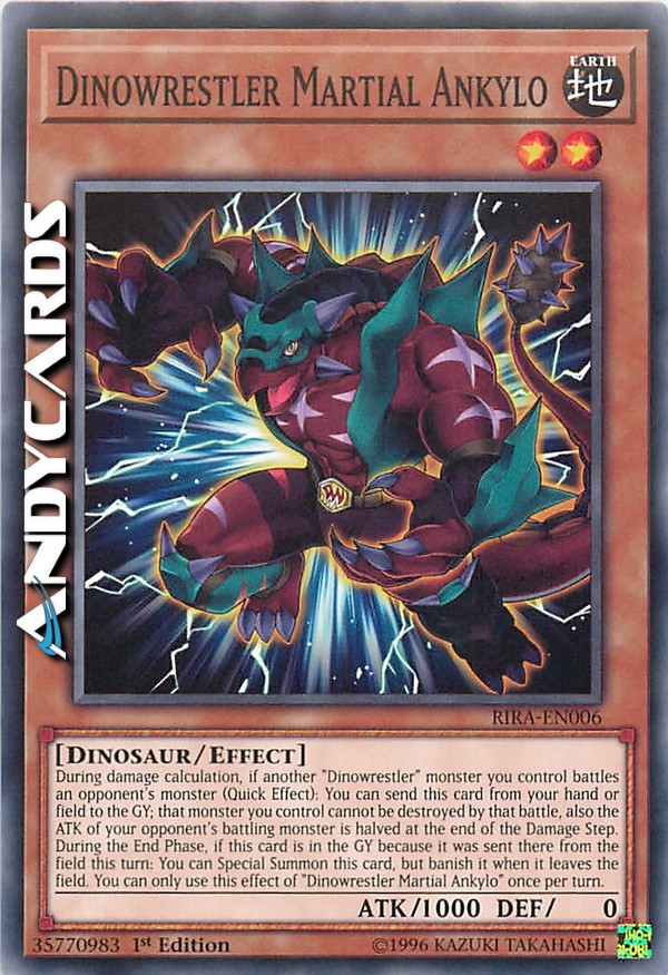 During damage calculation, if another "Dinowrestler" monster you control battles an opponent's monster (Quick Effect): You can send this card from your hand or field to the GY; that monster you control cannot be destroyed by that battle, also the ATK of your opponent's battling monster is halved at the end of the Damage Step. During the End Phase, if this card is in the GY because it was sent there from the field this turn: You can Special Summon this card, but banish it when it leaves the field. You can only use this effect of "Dinowrestler Martial Ankylo" once per turn.