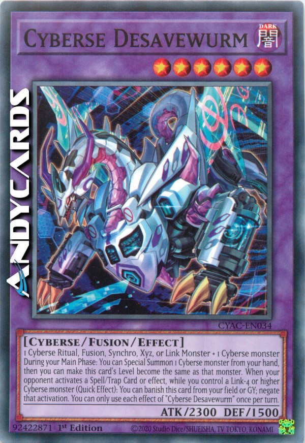 Durante la tua Main Phase: puoi Evocare Specialmente 1 mostro Cyberso dalla tua mano, poi puoi far diventare il Livello di questa carta lo stesso di quel mostro. Quando il tuo avversario attiva una Carta Magia/Trappola o un suo effetto, mentre controlli un mostro Link-4 o superiore Cyberso (Effetto Rapido): puoi bandire questa carta dal tuo Terreno o Cimitero; annulla quell'attivazione. Puoi utilizzare ogni effetto di "Disalvawurm Cyberso" una sola volta per turno.