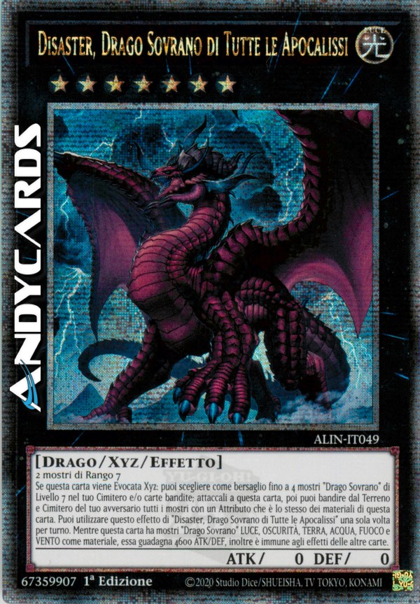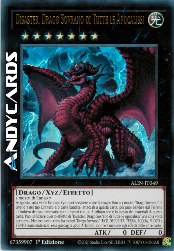 Se questa carta viene Evocata Xyz: puoi scegliere come bersaglio fino a 4 mostri "Drago Sovrano" di Livello 7 nel tuo Cimitero e/o carte bandite; attaccali a questa carta, poi puoi bandire dal Terreno e Cimitero del tuo avversario tutti i mostri con un Attributo che è lo stesso dei materiali di questa carta. Puoi utilizzare questo effetto di "Disaster, Drago Sovrano di Tutte le Apocalissi" una sola volta per turno. Mentre questa carta ha mostri "Drago Sovrano" LUCE, OSCURITÀ, TERRA, ACQUA, FUOCO e VENTO come materiale, essa guadagna 4600 ATK/DEF, inoltre è immune agli effetti delle altre carte.