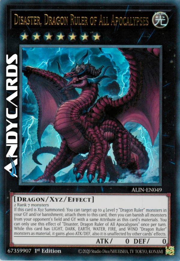 If this card is Xyz Summoned: You can target up to 4 Level 7 "Dragon Ruler" monsters in your GY and/or banishment; attach them to this card, then you can banish all monsters from your opponent's field and GY with a same Attribute as this card's materials. You can only use this effect of "Disaster, Dragon Ruler of All Apocalypses" once per turn. While this card has LIGHT, DARK, EARTH, WATER, FIRE, and WIND "Dragon Ruler" monsters as material, it gains 4600 ATK/DEF, also it is unaffected by other cards' effects.