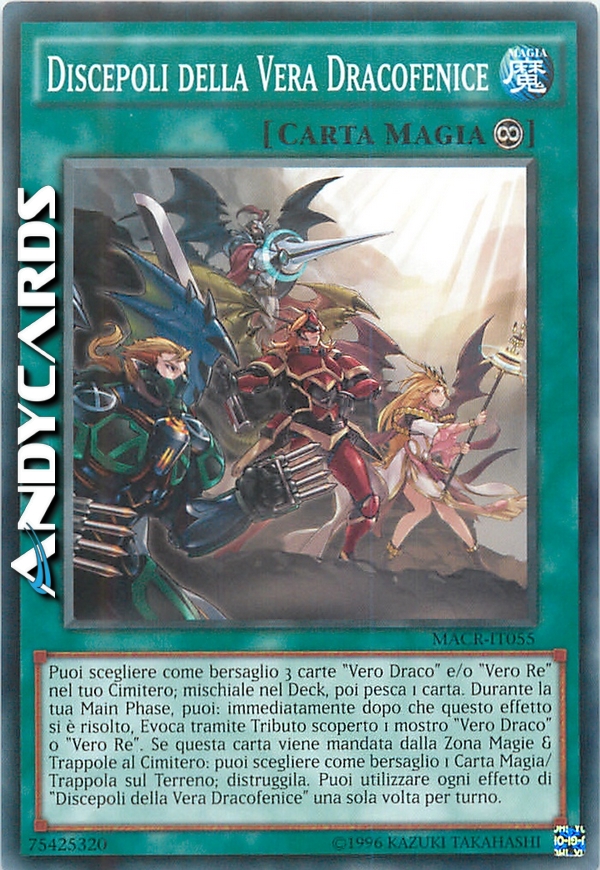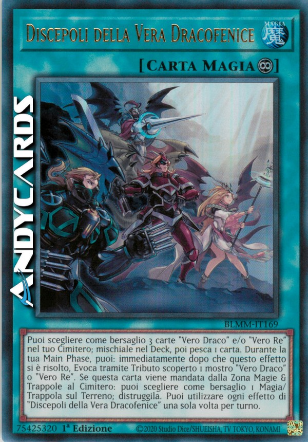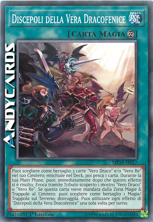 Puoi scegliere come bersaglio 3 carte "Vero Draco" e/o "Vero Re" nel tuo Cimitero; mischiale nel Deck, poi pesca 1 carta. Durante la tua Main Phase, puoi: immediatamente dopo che questo effetto si è risolto, Evoca tramite Tributo scoperto 1 mostro "Vero Draco" o "Vero Re". Se questa carta viene mandata dalla Zona Magie & Trappole al Cimitero: puoi scegliere come bersaglio 1 Magia/Trappola sul Terreno; distruggila. Puoi utilizzare ogni effetto di "Discepoli della Vera Dracofenice" una sola volta per turno.