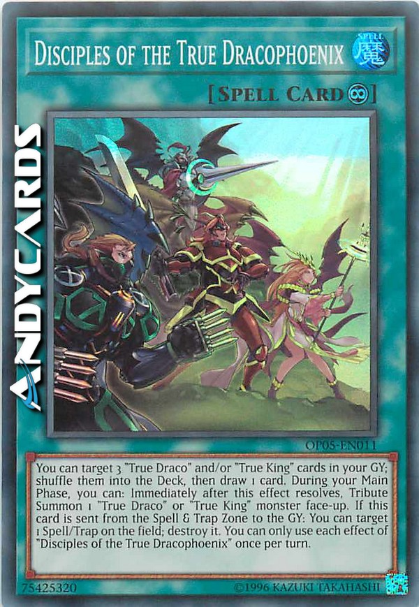 You can target 3 "True Draco" and/or "True King" cards in your Graveyard; shuffle them into the Deck, then draw 1 card. During your Main Phase, you can: Immediately after this effect resolves, Tribute Summon 1 "True Draco" or "True King" monsterface-up. If this card is sent from the Spell & Trap Zone to the Graveyard: You can target 1 Spell/Trap Card on the field; destroy it. You can only use each effect of "Disciples of the True Dracophoenix" once per turn.