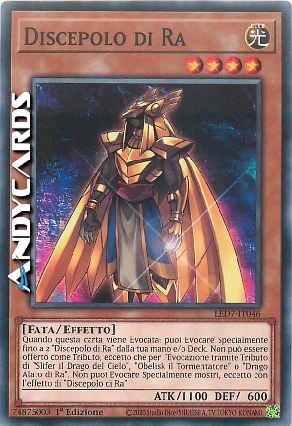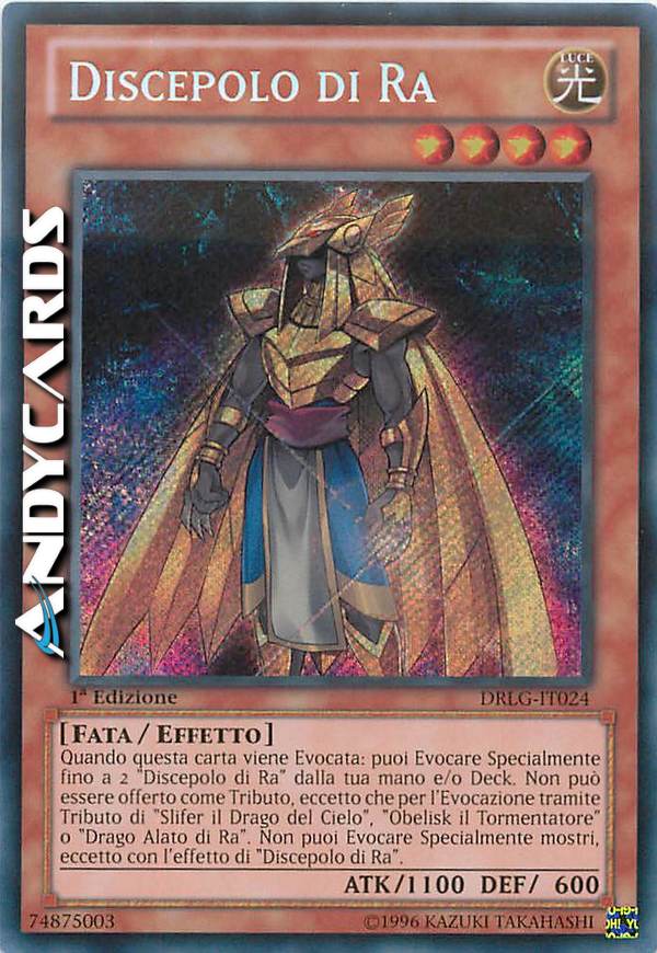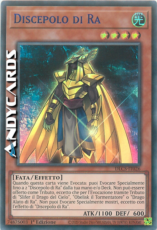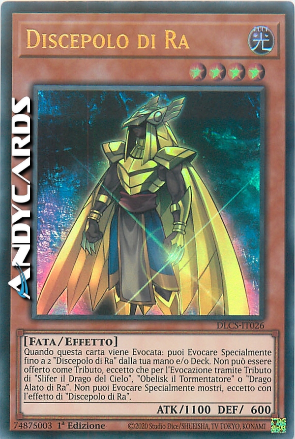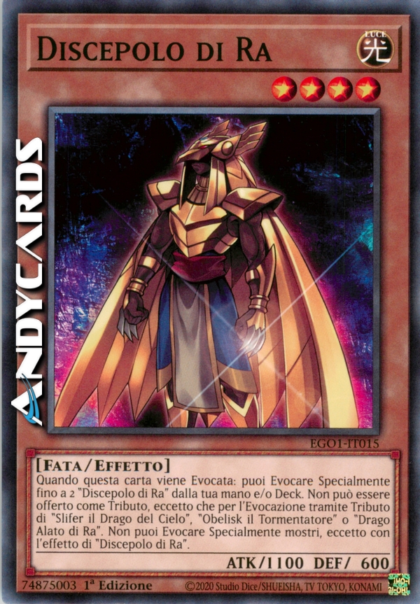 Quando questa carta viene Evocata: puoi Evocare Specialmente fino a 2 "Discepolo di Ra" dalla tua mano e/o Deck. Non può essere offerto come Tributo, eccetto che per l'Evocazione tramite Tributo di "Slifer il Drago del Cielo", "Obelisk il Tormentatore" o "Drago Alato di Ra". Non puoi Evocare Specialmente mostri, eccetto con l'effetto di "Discepolo di Ra".