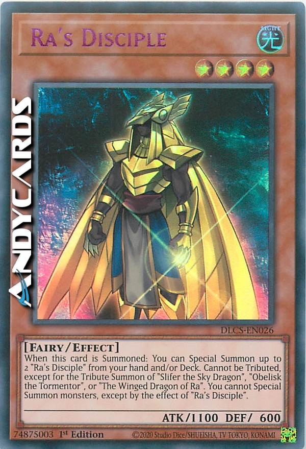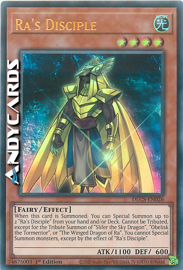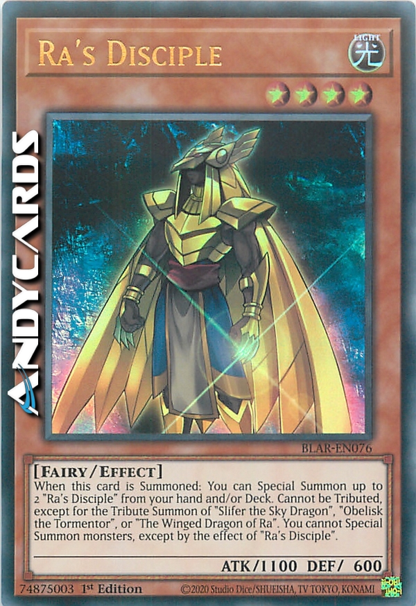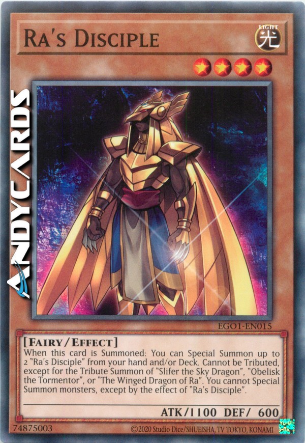 When this card is Summoned: You can Special Summon up to 2 "Ra's Disciple" from your hand and/or Deck. Cannot be Tributed, except for the Tribute Summon of "Slifer the Sky Dragon", "Obelisk the Tormentor", or "The Winged Dragon of Ra". You cannot Special Summon monsters, except by the effect of "Ra's Disciple".