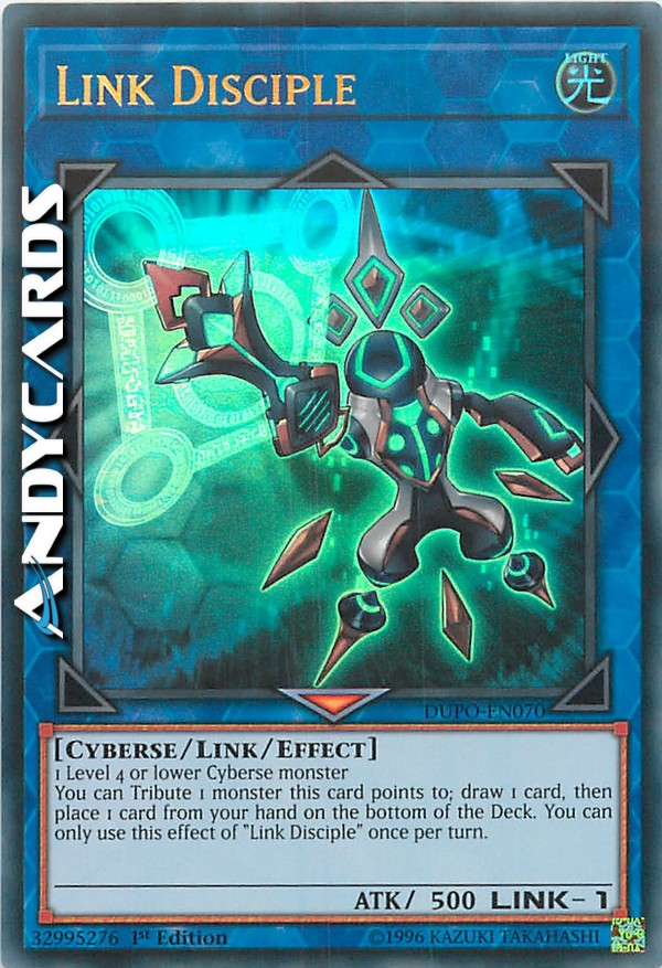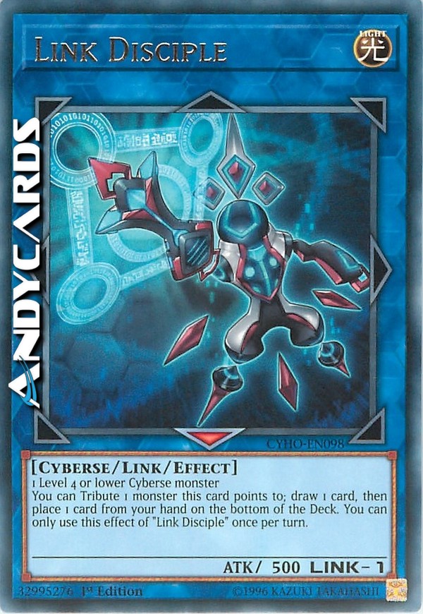 1 mostro Cyberso di Livello 4 o inferiore. Puoi offrire come Tributo 1 mostro puntato da questa carta; pesca 1 carta, poi metti 1 carta dalla tua mano in fondo al Deck. Puoi utilizzare questo effetto di "Discepolo Link" una sola volta per turno.