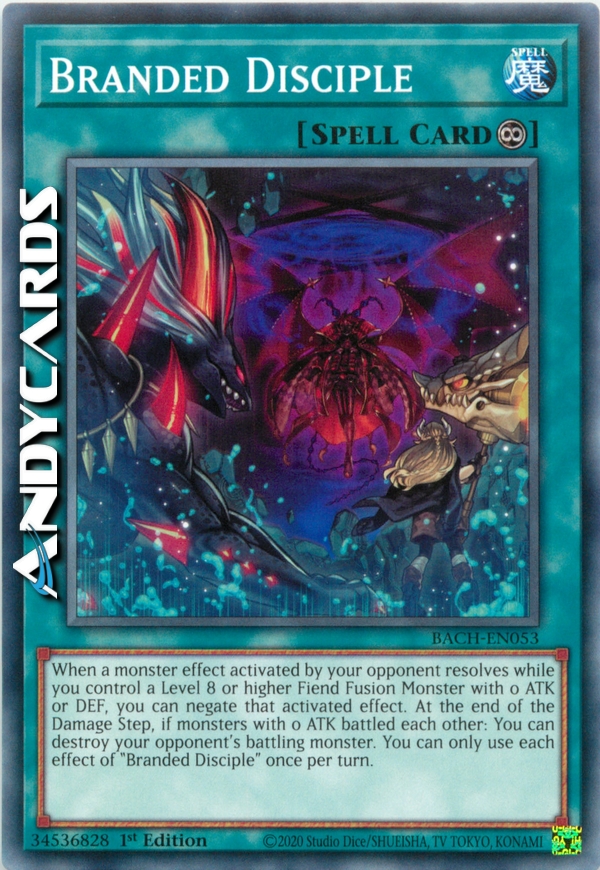 When a monster effect activated by your opponent resolves while you control a Level 8 or higher Fiend Fusion Monster with 0 ATK or DEF, you can negate that activated effect. At the end of the Damage Step, if monsters with 0 ATK battled each other: You can destroy your opponent's battling monster. You can only use each effect of "Branded Disciple" once per turn.
