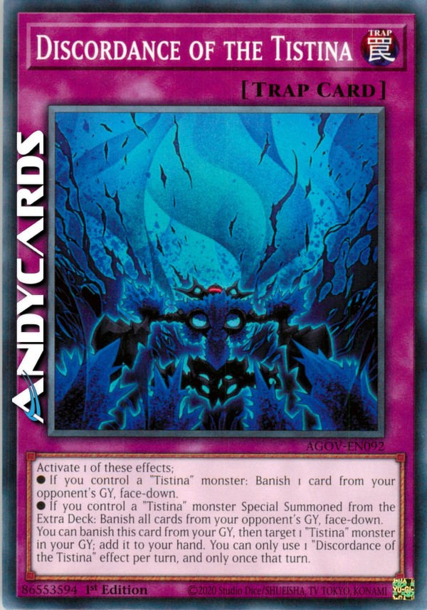Puoi bandire questa carta dal tuo Cimitero, poi scegliere come bersaglio 1 mostro "Tistina" nel tuo Cimitero; aggiungilo alla tua mano. Puoi utilizzare solo 1 effetto di "Discordanza di Tistina" per turno, e solo una volta in quel turno.