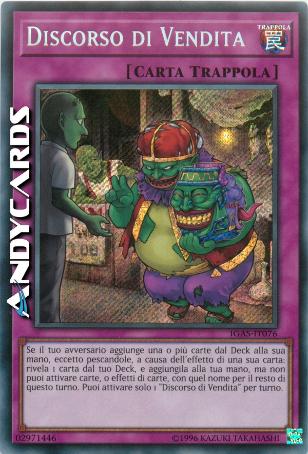 Se il tuo avversario aggiunge una o più carte dal Deck alla sua mano, eccetto pescandole, a causa dell'effetto di una sua carta: rivela 1 carta dal tuo Deck, e aggiungila alla tua mano, ma non puoi attivare carte, o effetti di carte, con quel nome per il resto di questo turno. Puoi attivare solo 1 "Discorso di Vendita" per turno.