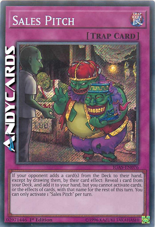 If your opponent adds a card(s) from the Deck to their hand, except by drawing them, by their card effect: Reveal 1 card from your Deck, and add it to your hand, but you cannot activate cards, or the effects of cards, with that name for the rest of this turn. You can only activate 1 "Sales Pitch" per turn.