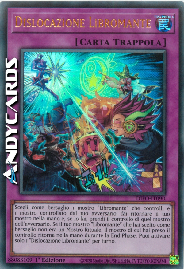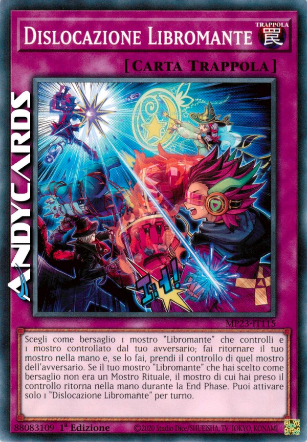 Scegli come bersaglio 1 mostro "Libromante" che controlli e 1 mostro controllato dal tuo avversario; fai ritornare il tuo mostro nella mano e, se lo fai, prendi il controllo di quel mostro dell'avversario. Se il tuo mostro "Libromante" che hai scelto come bersaglio non era un Mostro Rituale, il mostro di cui hai preso il controllo ritorna nella mano durante la End Phase. Puoi attivare solo 1 "Dislocazione Libromante" per turno.