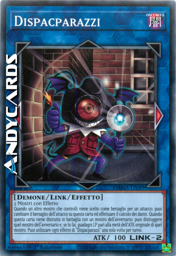 Quando un altro mostro che controlli viene scelto come bersaglio per un attacco: puoi cambiare il bersaglio dell'attacco su questa carta ed effettuare il calcolo dei danni. Quando questa carta viene distrutta in battaglia con un mostro dell'avversario: puoi distruggere quel mostro dell'avversario e, se lo fai, guadagni LP pari alla metà dell'ATK originale di quel mostro. Puoi utilizzare ogni effetto di "Dispacparazzi" una sola volta per turno.