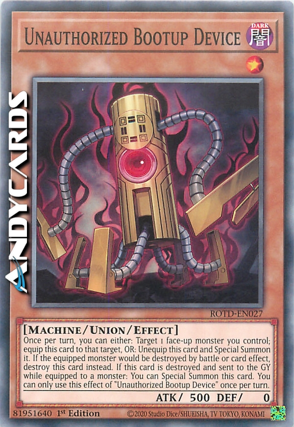 Una volta per turno, puoi: scegliere come bersaglio 1 mostro scoperto che controlli; equipaggia questa carta a quel bersaglio, OPPURE: disequipaggiare questa carta ed Evocarla Specialmente. Se il mostro equipaggiato sta per essere distrutto in battaglia o dall'effetto di una carta, distruggi invece questa carta. Se questa carta viene distrutta e mandata al Cimitero mentre è equipaggiata a un mostro: puoi Evocare Specialmente questa carta. Puoi utilizzare questo effetto di "Dispositivo di Avvio Non Autorizzato" una sola volta per turno.