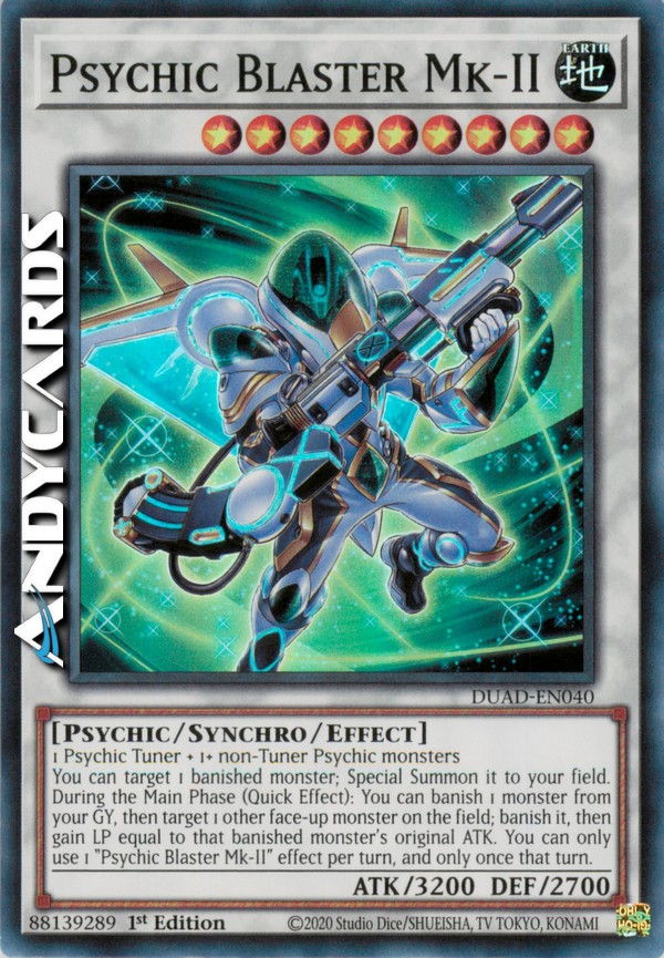 You can target 1 banished monster; Special Summon it to your field. During the Main Phase (Quick Effect): You can banish 1 monster from your GY, then target 1 other face-up monster on the field; banish it, then gain LP equal to that banished monster's original ATK. You can only use 1 "Psychic Blaster Mk-II" effect per turn, and only once that turn.
