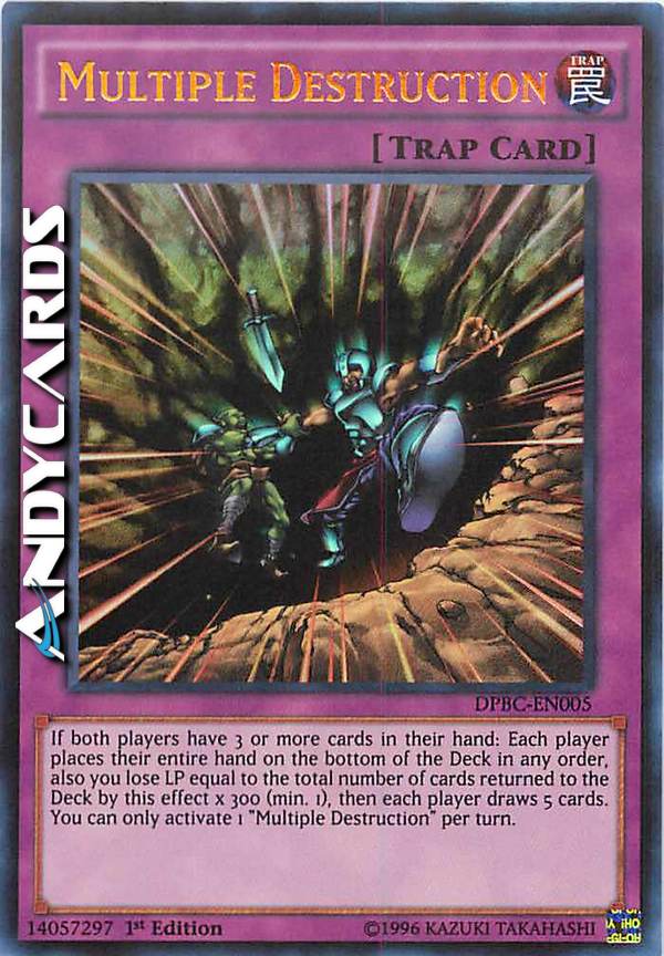 Se entrambi i giocatori hanno 3 o più carte nella loro mano: ogni giocatore mette tutta la sua mano in fondo al Deck in qualsiasi ordine, inoltre tu perdi LP pari al numero totale di carte fatte ritornare nel Deck da questo effetto x 300 (minimo 1), poi ogni giocatore pesca 5 carte. Puoi attivare solo 1 "Distruzione Multipla" per turno.