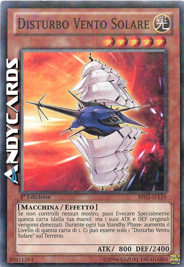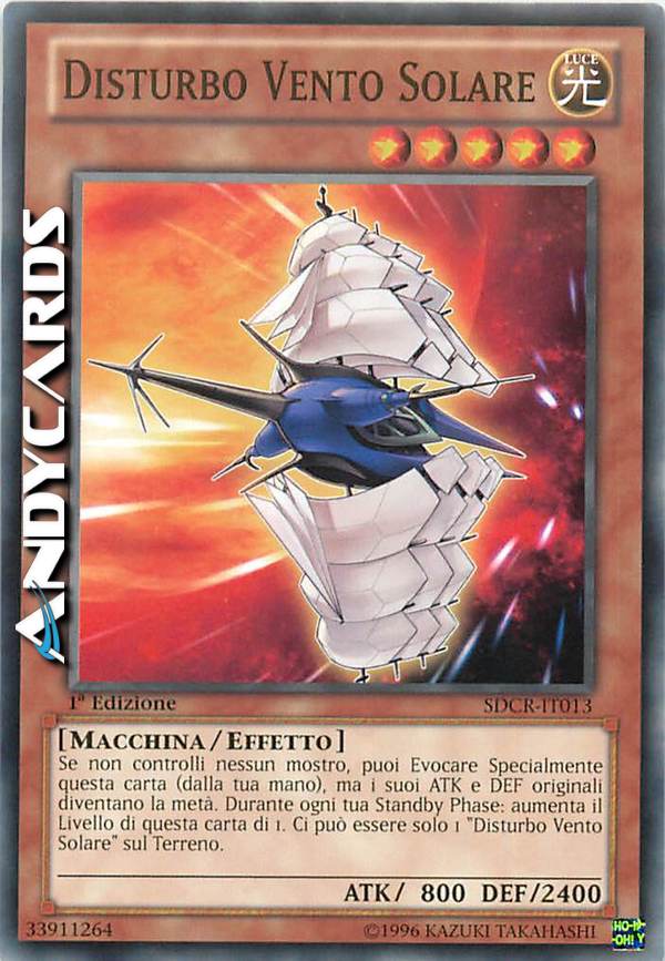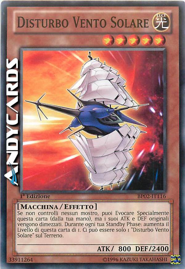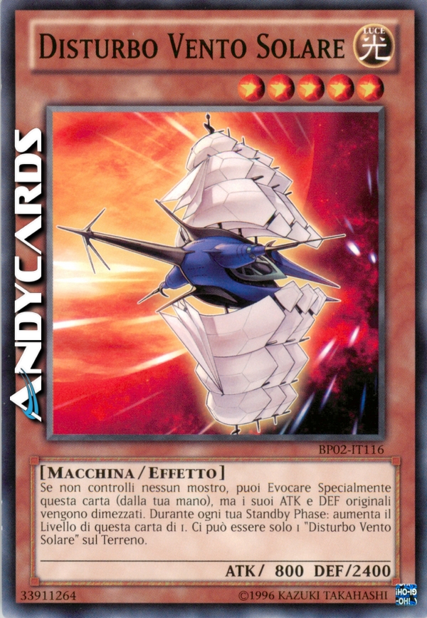 Se non controlli nessun mostro, puoi Evocare Specialmente questa carta (dalla tua mano), ma i suoi ATK e DEF originali vengono dimezzati. Durante ogni tua Standby Phase: aumenta il Livello di questa carta di 1. Ci può essere solo 1 "Disturbo Vento Solare" sul Terreno.