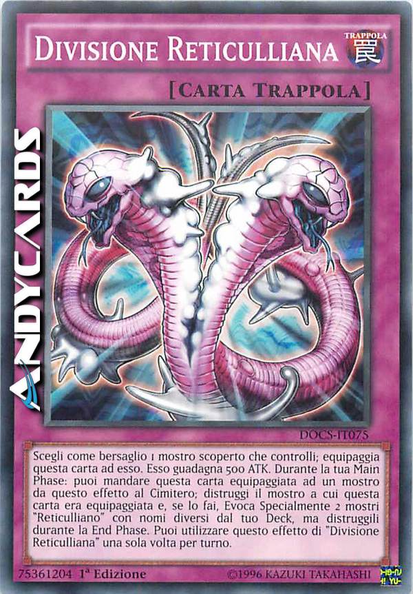 Scegli come bersaglio 1 mostro scoperto che controlli; equipaggia questa carta ad esso. Esso guadagna 500 ATK. Durante la tua Main Phase: puoi mandare questa carta equipaggiata ad un mostro da questo effetto al Cimitero; distruggi il mostro a cui questa carta era equipaggiata e, se lo fai, Evoca Specialmente 2 mostri "Reticulliano" con nomi diversi dal tuo Deck, ma distruggili durante la End Phase. Puoi utilizzare questo effetto di "Divisione Reticulliana" una sola volta per turno.