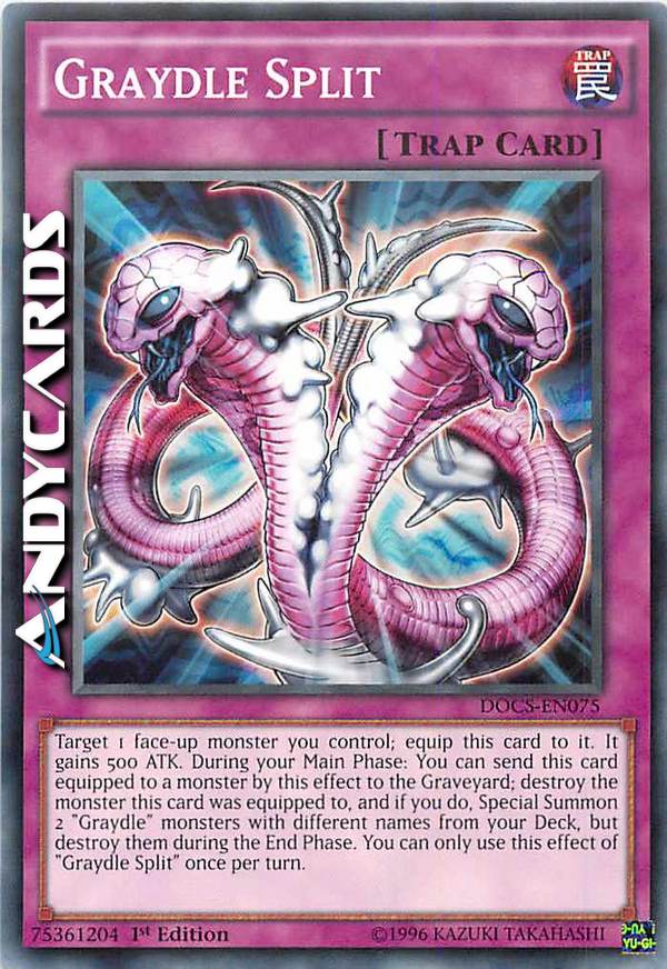 Target 1 face-up monster you control; equip this card to it. It gains 500 ATK. During your Main Phase: You can send this card equipped to a monster by this effect to the Graveyard; destroy the monster this card was equipped to, and if you do, Special Summon 2 "Graydle" monsters with different names from your Deck, but destroy them during the End Phase. You can only use this effect of "Graydle Split" once per turn.