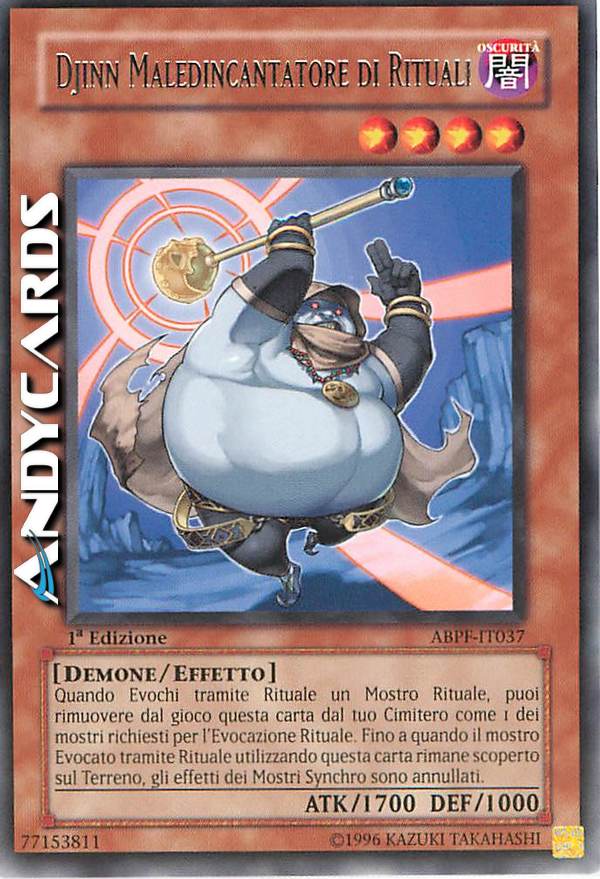 Quando Evochi tramite Rituale un mostro, puoi bandire questa carta dal tuo Cimitero come 1 dei mostri richiesti per l'Evocazione Rituale. Mentre il mostro Evocato tramite Rituale utilizzando questa carta è scoperto sul Terreno, gli effetti dei Mostri Synchro sono annullati.