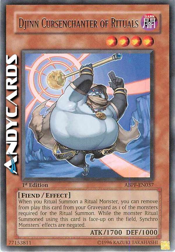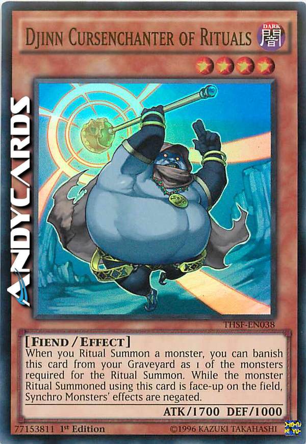When you Ritual Summon a Ritual Monster, you can remove from play this card from your Graveyard as 1 of the monsters required for the Ritual Summon. While the Ritual Monster this card was used in the Ritual Summon for is face-up on the field, negate the effect(s) of Synchro Monsters.