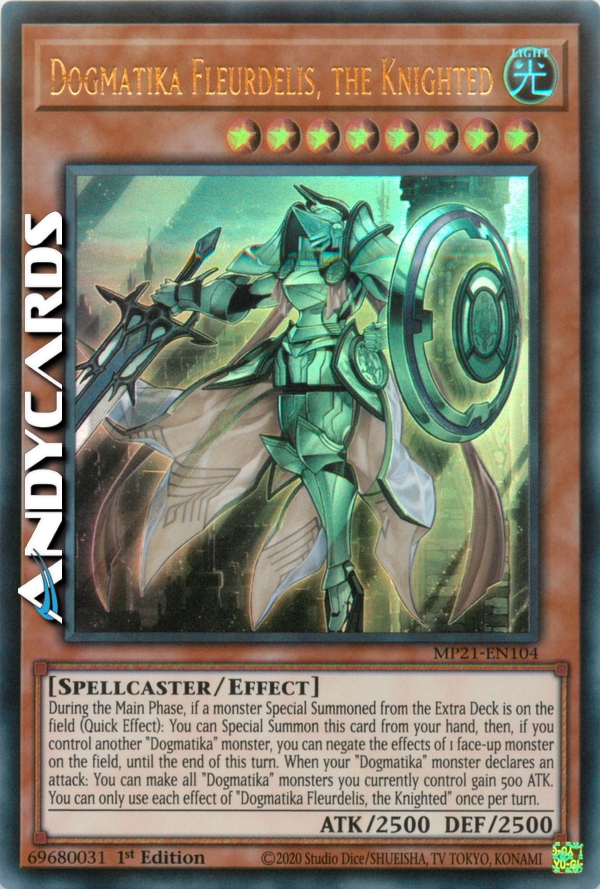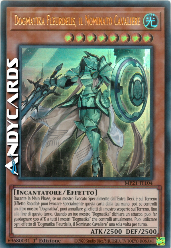 Durante la Main Phase, se un mostro Evocato Specialmente dall'Extra Deck è sul Terreno (Effetto Rapido): puoi Evocare Specialmente questa carta dalla tua mano, poi, se controlli un altro mostro "Dogmatika", puoi annullare gli effetti di 1 mostro scoperto sul Terreno, fino alla fine di questo turno. Quando un tuo mostro "Dogmatika" dichiara un attacco: puoi far guadagnare 500 ATK a tutti i mostri "Dogmatika" che controlli attualmente. Puoi utilizzare ogni effetto di "Dogmatika Fleurdelis, il Nominato Cavaliere" una sola volta per turno.